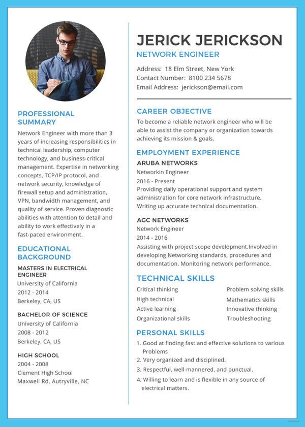 Employers use resumes as the first step in identifying and selecting viable candidates for jobs and it is important that your resume properly presents your affect experience and scholastic qualifications. A well-written resume presents an impressive image of you to employers. Employers see at hundreds of resumes for the same job and stop taking place choosing just one. It is important that your resume is properly formatted and provides every relevant assistance just about you. Looking at professionally written network engineer resume sample free download can urge on you make your own impressive resume and come up with the money for all the counsel employers need.