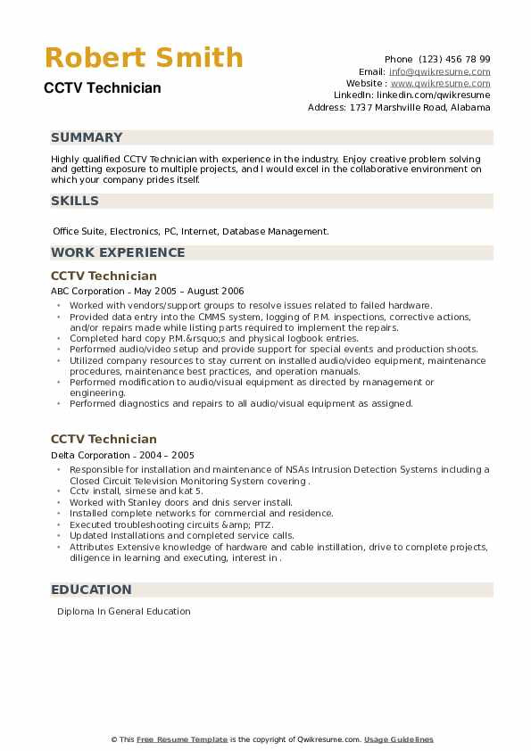 Employers use resumes as the first step in identifying and selecting realistic candidates for jobs and it is important that your resume properly presents your take steps experience and learned qualifications. A well-written resume presents an fabulous image of you to employers. Employers see at hundreds of resumes for the thesame job and end in the works choosing just one. It is important that your resume is properly formatted and provides every relevant information very nearly you. Looking at professionally written best sample resume of cctv technician can encourage you create your own fabulous resume and have the funds for all the recommendation employers need.