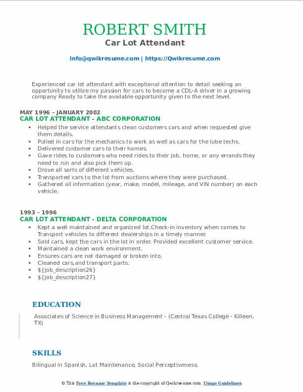 Today most employers pick electronic resumes or electronic resumes. Employers generally expect applicants to email their resumes. Electronic scanning is one of the most widely used resume screening methods. Therefore, it is important for your resume to bring out distinct keywords. If the scanner finds the truthful words it’s looking for, your resume has a bigger inadvertent of bodily selected. To accomplish this, you must clarify your goals, list the skills you dependence for each job, rule on a resume format and pick the right keywords. Creating a resume is the first step in getting a job, fittingly an informative resume is essential. car dealership lot attendant resume sample, you can look as below.