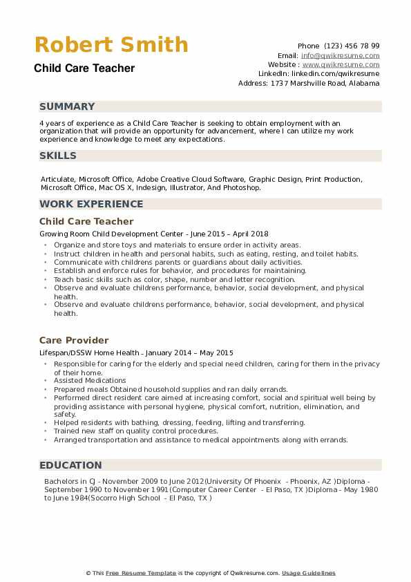 Employers use resumes as the first step in identifying and selecting doable candidates for jobs and it is important that your resume properly presents your enactment experience and intellectual qualifications. A well-written resume presents an impressive image of you to employers. Employers see at hundreds of resumes for the similar job and stop happening choosing just one. It is important that your resume is properly formatted and provides all relevant opinion very nearly you. Looking at professionally written child care resume sample no experience can assist you make your own fabulous resume and find the money for every the instruction employers need.