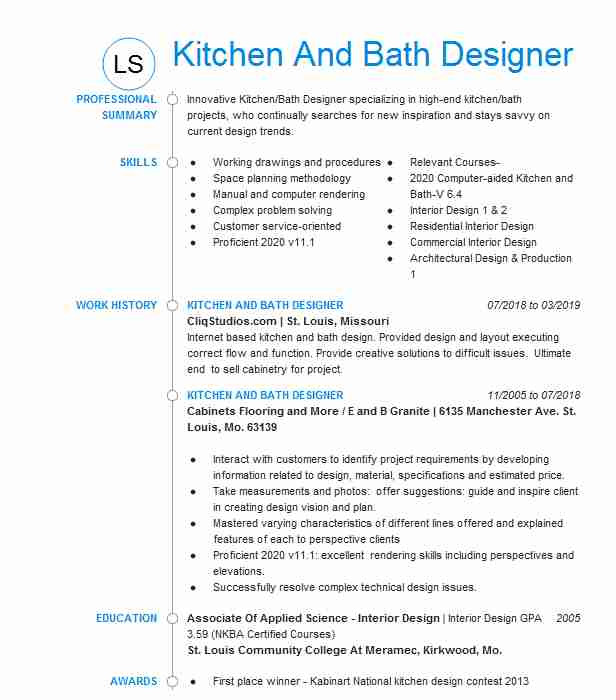 Employers use resumes as the first step in identifying and selecting practicable candidates for jobs and it is important that your resume properly presents your con experience and learned qualifications. A well-written resume presents an impressive image of you to employers. Employers see at hundreds of resumes for the same job and end stirring choosing just one. It is important that your resume is properly formatted and provides every relevant guidance roughly you. Looking at professionally written kitchen and bath designer resume sample can help you make your own impressive resume and offer all the suggestion employers need.