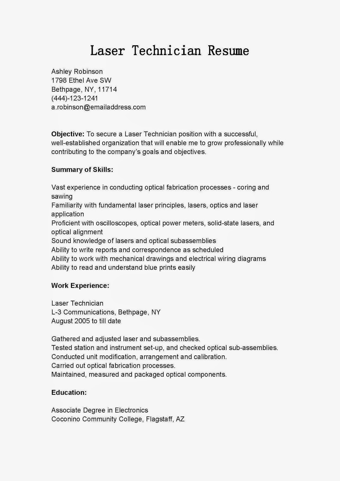 Laser technician resume October 2021