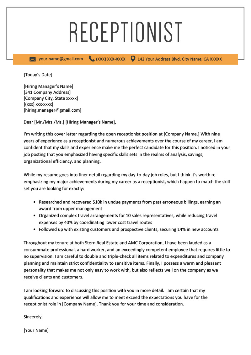 Sample Cover Letter for Resume Receptionist– A resume is a formal document that contains a summary of relevant produce a result experience and education and is usually created for the seek of obtaining a job interview. Resume is with known as Curriculum Vitae or CV. Curriculum Vitae is Latin for vibrancy story.