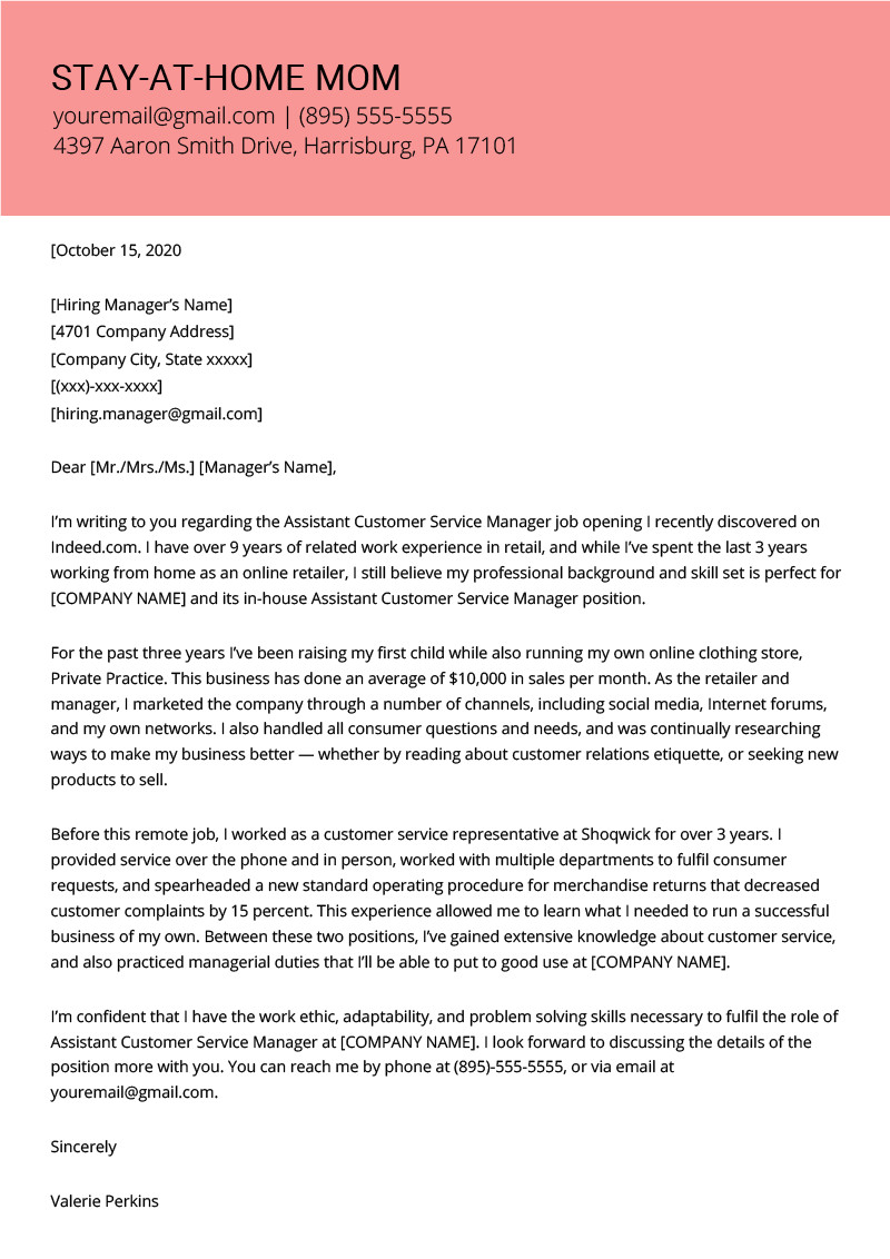 Sample Resume Cover Letter for Stay at Home Mom– A resume is a formal document that contains a summary of relevant exploit experience and education and is usually created for the intend of obtaining a job interview. Resume is furthermore known as Curriculum Vitae or CV. Curriculum Vitae is Latin for liveliness story.