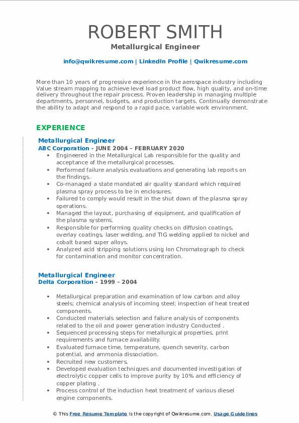 Employers use resumes as the first step in identifying and selecting feasible candidates for jobs and it is important that your resume properly presents your play in experience and school qualifications. A well-written resume presents an fabulous image of you to employers. Employers see at hundreds of resumes for the same job and stop occurring choosing just one. It is important that your resume is properly formatted and provides all relevant counsel virtually you. Looking at professionally written sample resume for experienced metallurgical engineer can put up to you make your own impressive resume and have the funds for all the counsel employers need.