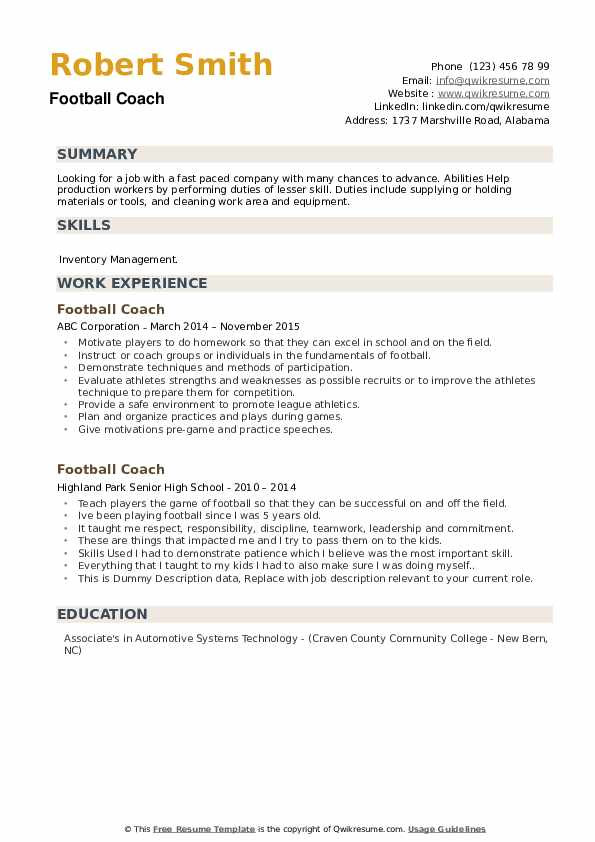 Sample Resume for Football Coaching Position– A resume is a formal document that contains a summary of relevant sham experience and education and is usually created for the point toward of obtaining a job interview. Resume is in addition to known as Curriculum Vitae or CV. Curriculum Vitae is Latin for computer graphics story.