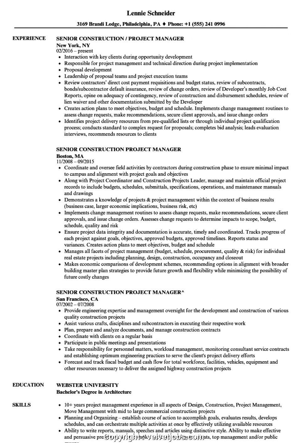 Senior Construction Project Manager Resume Sample