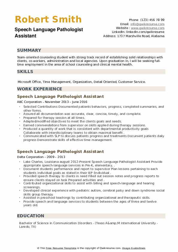 Speech Language Pathology assistant Resume Sample– A resume is a formal document that contains a summary of relevant show experience and education and is usually created for the set sights on of obtaining a job interview. Resume is in addition to known as Curriculum Vitae or CV. Curriculum Vitae is Latin for computer graphics story.