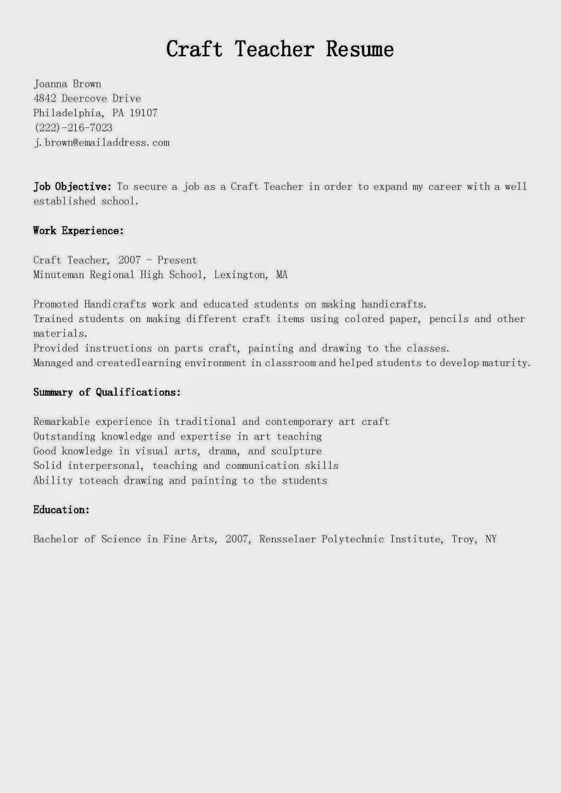 Art and Craft Teacher Resume Samples Resume Samples Craft Teacher Resume Sample and all other pictures, designs or photos on our website are copyright of their respective owners. we get our pictures from another websites, search engines and other sources to use as an inspiration for you. please contact us if you think we are infringing copyright of your pictures using contact page. we will be very happy to help you.