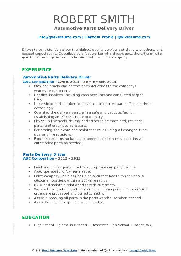 Auto Parts Delivery Driver Resume Sample Parts Delivery Driver Resume Samples and all other pictures, designs or photos on our website are copyright of their respective owners. we get our pictures from another websites, search engines and other sources to use as an inspiration for you. please contact us if you think we are infringing copyright of your pictures using contact page. we will be very happy to help you.