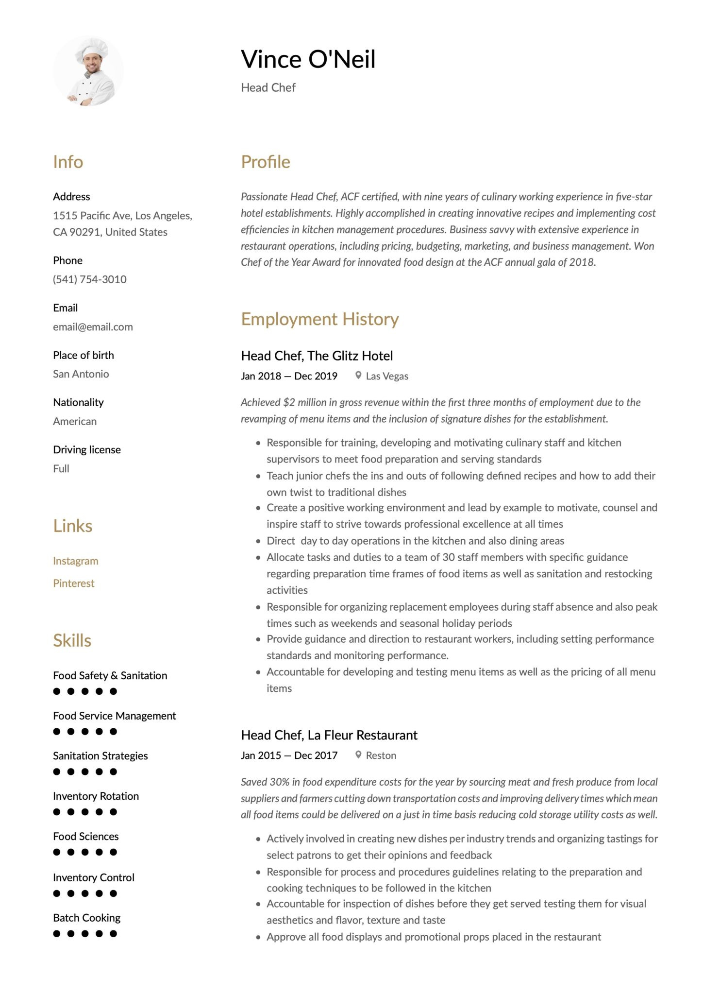 Chef Resume Sample by Resume Genius Sample Chef Resume and all other pictures, designs or photos on our website are copyright of their respective owners. we get our pictures from another websites, search engines and other sources to use as an inspiration for you. please contact us if you think we are infringing copyright of your pictures using contact page. we will be very happy to help you.