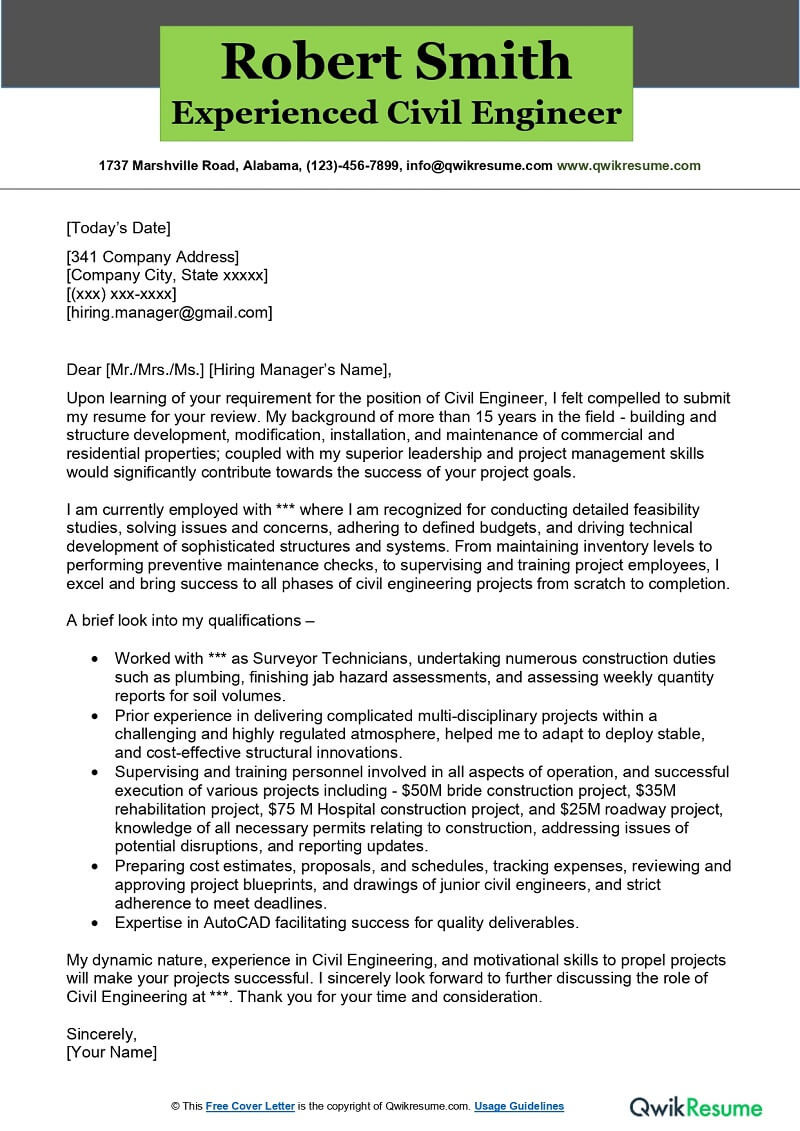 Civil Engineering Resume Cover Letter Samples Experienced Civil Engineer Cover Letter Examples – Qwikresume and all other pictures, designs or photos on our website are copyright of their respective owners. we get our pictures from another websites, search engines and other sources to use as an inspiration for you. please contact us if you think we are infringing copyright of your pictures using contact page. we will be very happy to help you.