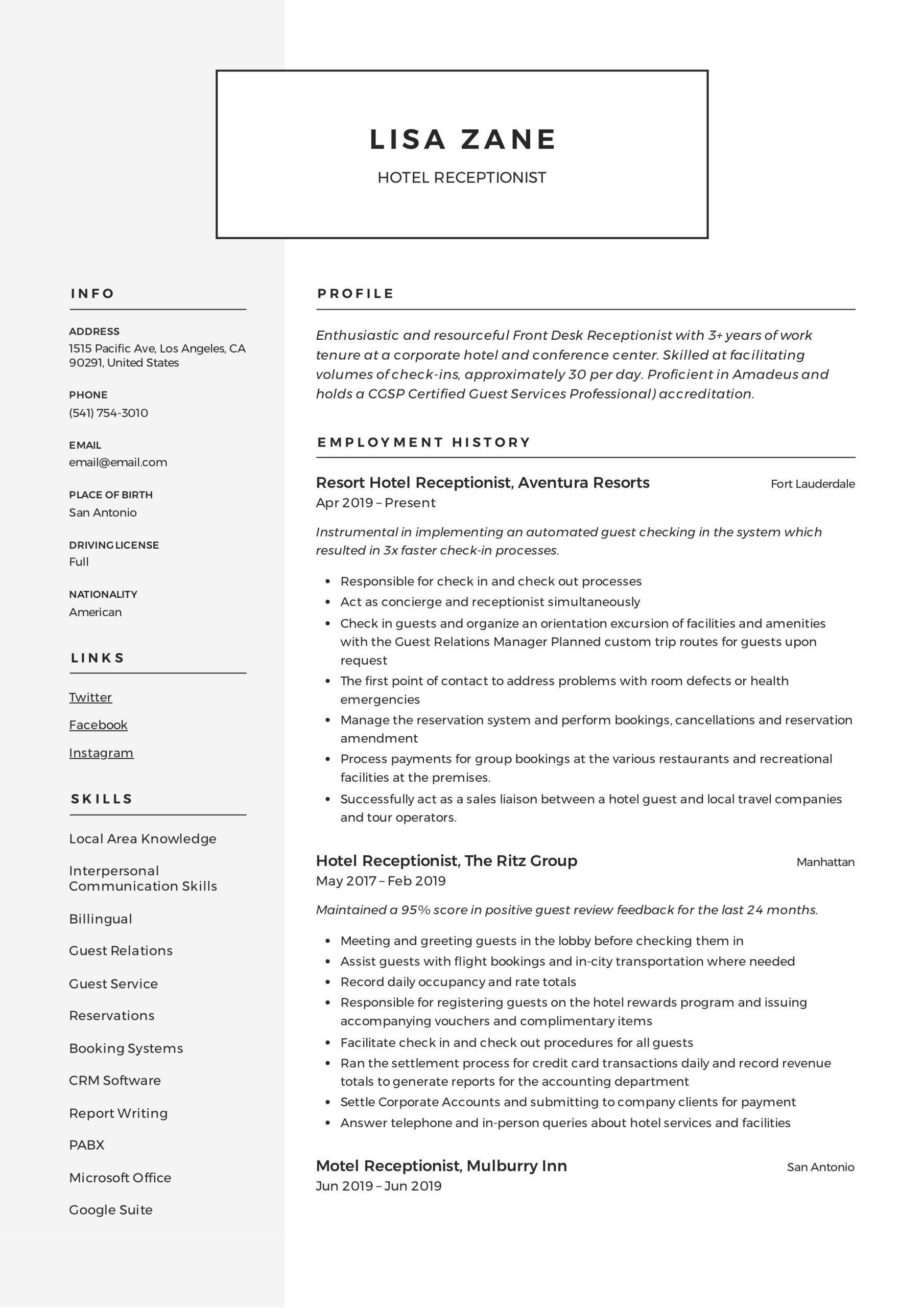 Days Inn Front Desk Resume Sample Hotel Receptionist Resume & Writing Guide 12 Templates 2022 and all other pictures, designs or photos on our website are copyright of their respective owners. we get our pictures from another websites, search engines and other sources to use as an inspiration for you. please contact us if you think we are infringing copyright of your pictures using contact page. we will be very happy to help you.