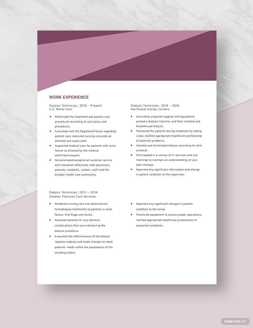 Dialysis Patient Care Technician Resume Sample Dialysis Technician Resume Template – Word, Apple Pages Template.net and all other pictures, designs or photos on our website are copyright of their respective owners. we get our pictures from another websites, search engines and other sources to use as an inspiration for you. please contact us if you think we are infringing copyright of your pictures using contact page. we will be very happy to help you.