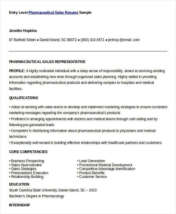 Back To Entry Level Pharmaceutical Sales Resume Sample