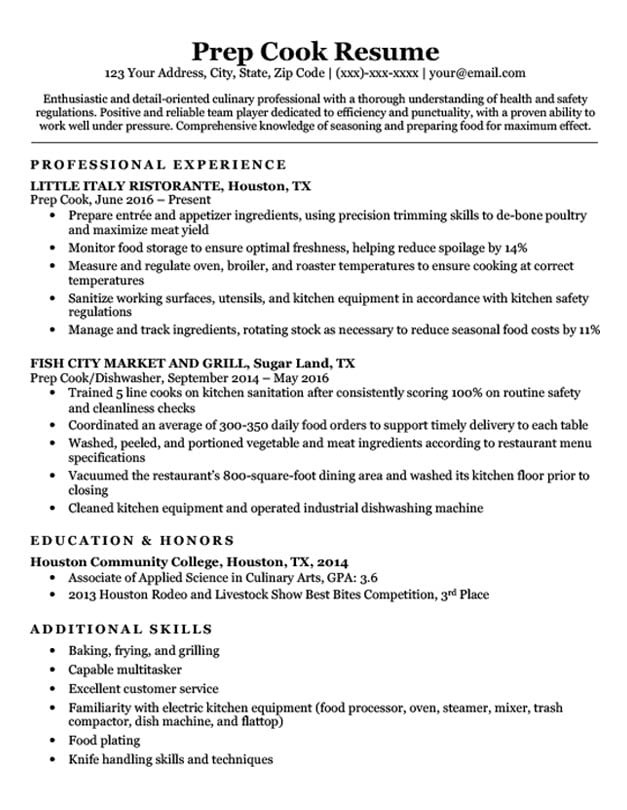 Entry Level Prep Cook Resume Sample Prep Cook Resume and all other pictures, designs or photos on our website are copyright of their respective owners. we get our pictures from another websites, search engines and other sources to use as an inspiration for you. please contact us if you think we are infringing copyright of your pictures using contact page. we will be very happy to help you.