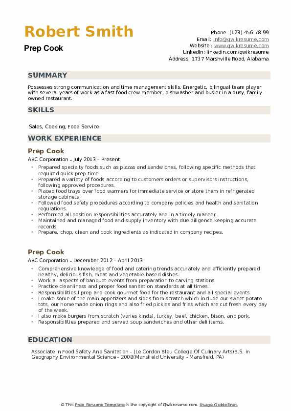 Entry Level Prep Cook Resume Sample Prep Cook Resume Samples and all other pictures, designs or photos on our website are copyright of their respective owners. we get our pictures from another websites, search engines and other sources to use as an inspiration for you. please contact us if you think we are infringing copyright of your pictures using contact page. we will be very happy to help you.