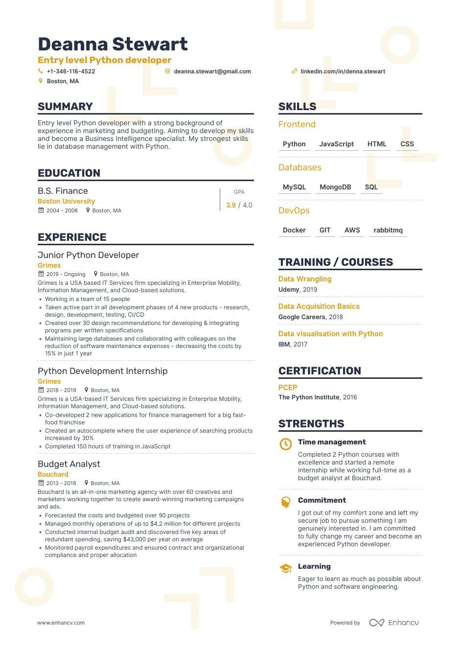 Entry Level Python Developer Resume Sample Professional Python Developer Resume Examples & Guide for 2022 … and all other pictures, designs or photos on our website are copyright of their respective owners. we get our pictures from another websites, search engines and other sources to use as an inspiration for you. please contact us if you think we are infringing copyright of your pictures using contact page. we will be very happy to help you.