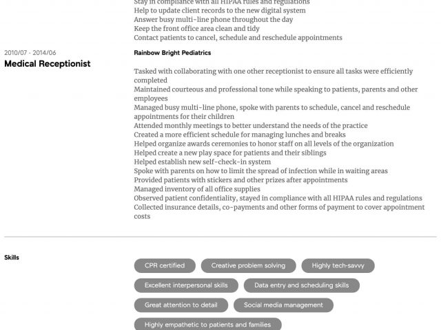 Front Desk Medical Receptionist Resume Sample Medical Receptionist Resume Samples All Experience Levels … and all other pictures, designs or photos on our website are copyright of their respective owners. we get our pictures from another websites, search engines and other sources to use as an inspiration for you. please contact us if you think we are infringing copyright of your pictures using contact page. we will be very happy to help you.