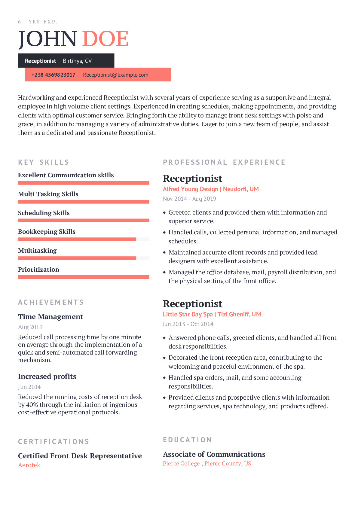 Front Desk Receptionist Reception Resume Sample Receptionist Resume Example with Content Sample Craftmycv and all other pictures, designs or photos on our website are copyright of their respective owners. we get our pictures from another websites, search engines and other sources to use as an inspiration for you. please contact us if you think we are infringing copyright of your pictures using contact page. we will be very happy to help you.