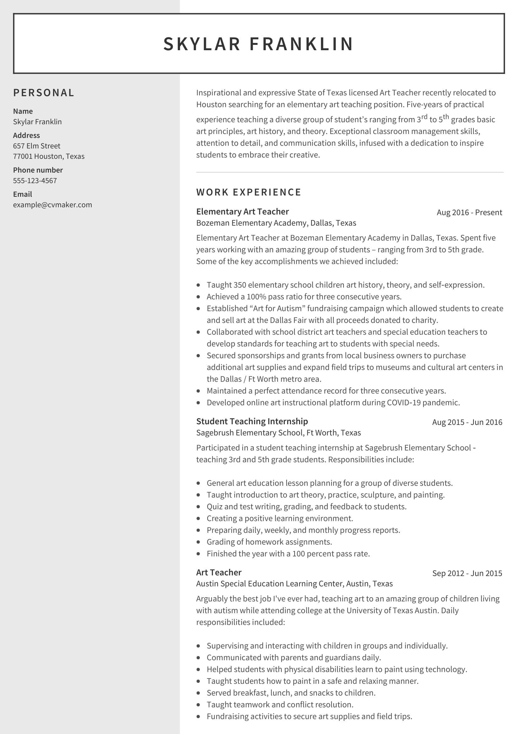 Art Teacher Resume Examples & Writing Guide 2021 – CVmaker.com