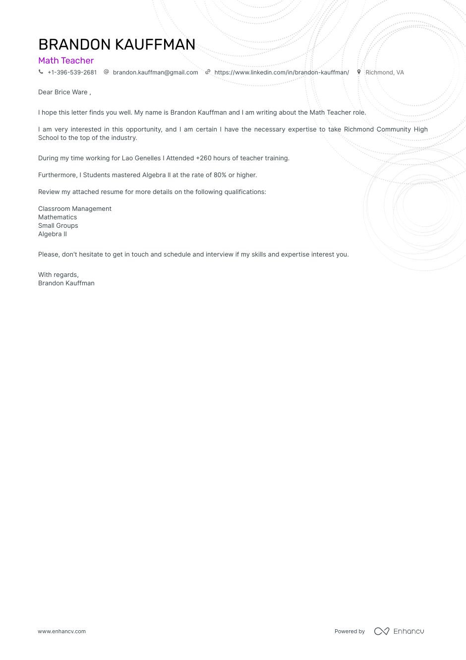 Math Teacher Sample Resume Cover Letter Real Math Teacher Cover Letter Example for 2022 and all other pictures, designs or photos on our website are copyright of their respective owners. we get our pictures from another websites, search engines and other sources to use as an inspiration for you. please contact us if you think we are infringing copyright of your pictures using contact page. we will be very happy to help you.