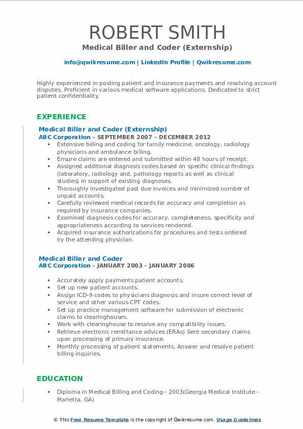 Medical Billing and Coding Externship Resume Sample Medical Biller and Coder Resume Samples and all other pictures, designs or photos on our website are copyright of their respective owners. we get our pictures from another websites, search engines and other sources to use as an inspiration for you. please contact us if you think we are infringing copyright of your pictures using contact page. we will be very happy to help you.