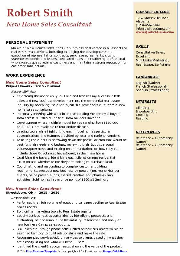 New Home Sales Consultant Resume Sample New Home Sales Consultant Resume Samples and all other pictures, designs or photos on our website are copyright of their respective owners. we get our pictures from another websites, search engines and other sources to use as an inspiration for you. please contact us if you think we are infringing copyright of your pictures using contact page. we will be very happy to help you.