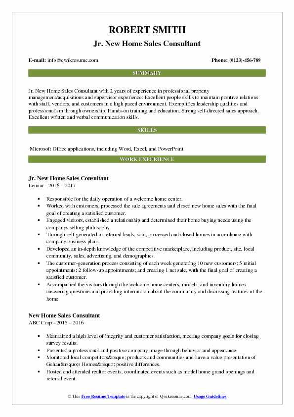 New Home Sales Consultant Resume Sample New Home Sales Consultant Resume Samples and all other pictures, designs or photos on our website are copyright of their respective owners. we get our pictures from another websites, search engines and other sources to use as an inspiration for you. please contact us if you think we are infringing copyright of your pictures using contact page. we will be very happy to help you.