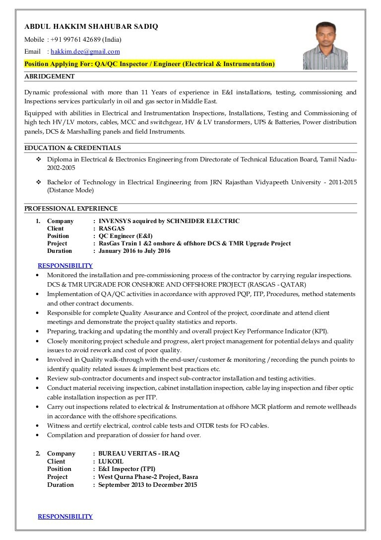 Qa Qc Electrical Engineer Resume Sample Electrical Inspector Cv and all other pictures, designs or photos on our website are copyright of their respective owners. we get our pictures from another websites, search engines and other sources to use as an inspiration for you. please contact us if you think we are infringing copyright of your pictures using contact page. we will be very happy to help you.