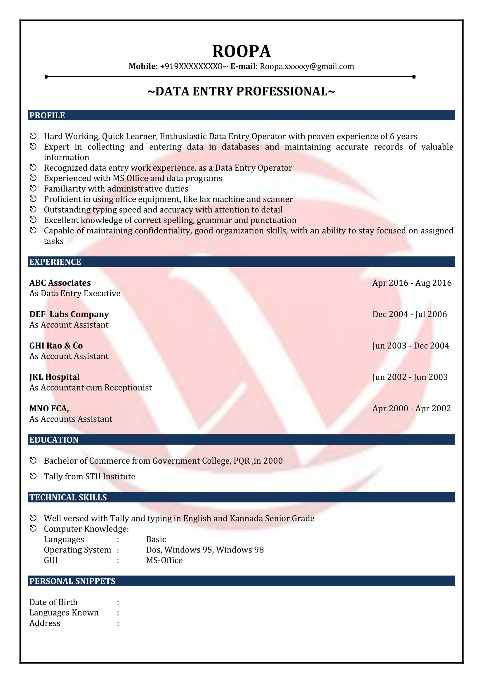 Resume Samples for Data Entry Jobs Data Entry Sample Resumes, Download Resume format Templates! and all other pictures, designs or photos on our website are copyright of their respective owners. we get our pictures from another websites, search engines and other sources to use as an inspiration for you. please contact us if you think we are infringing copyright of your pictures using contact page. we will be very happy to help you.