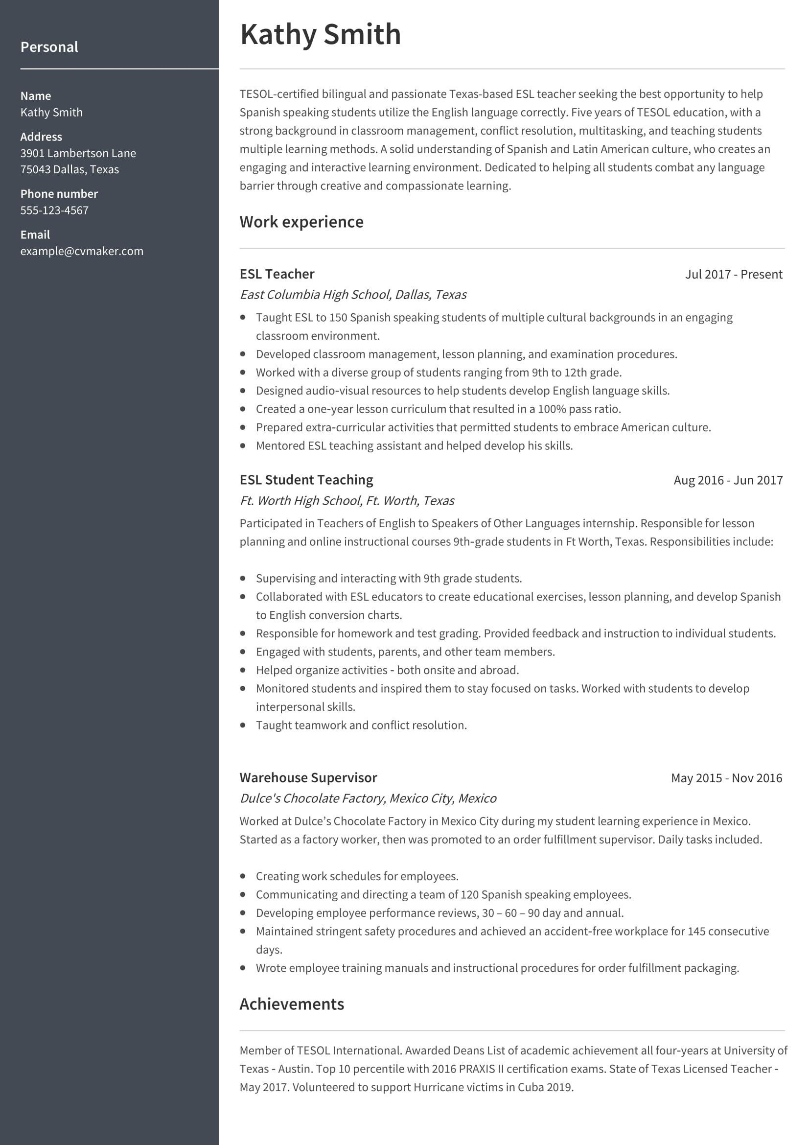 Sample Action Sentences for Teacher Resume Esl Teacher Resume Examples & Writing Guide 2021 – Cvmaker.com and all other pictures, designs or photos on our website are copyright of their respective owners. we get our pictures from another websites, search engines and other sources to use as an inspiration for you. please contact us if you think we are infringing copyright of your pictures using contact page. we will be very happy to help you.