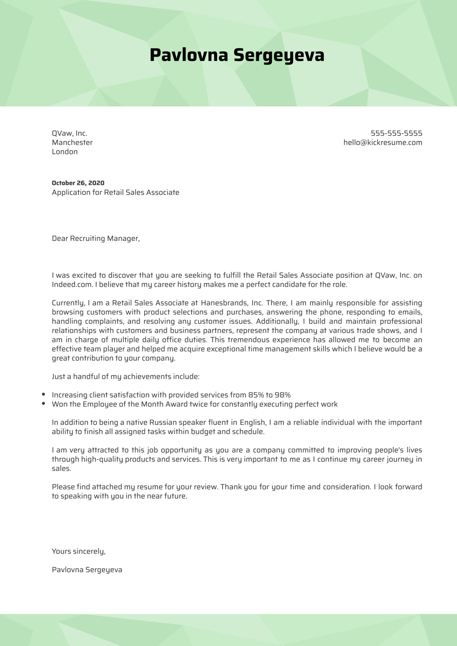 Sample Cover Letter for Resume Retail Sales Retail Sales associate Cover Letter Sample and all other pictures, designs or photos on our website are copyright of their respective owners. we get our pictures from another websites, search engines and other sources to use as an inspiration for you. please contact us if you think we are infringing copyright of your pictures using contact page. we will be very happy to help you.