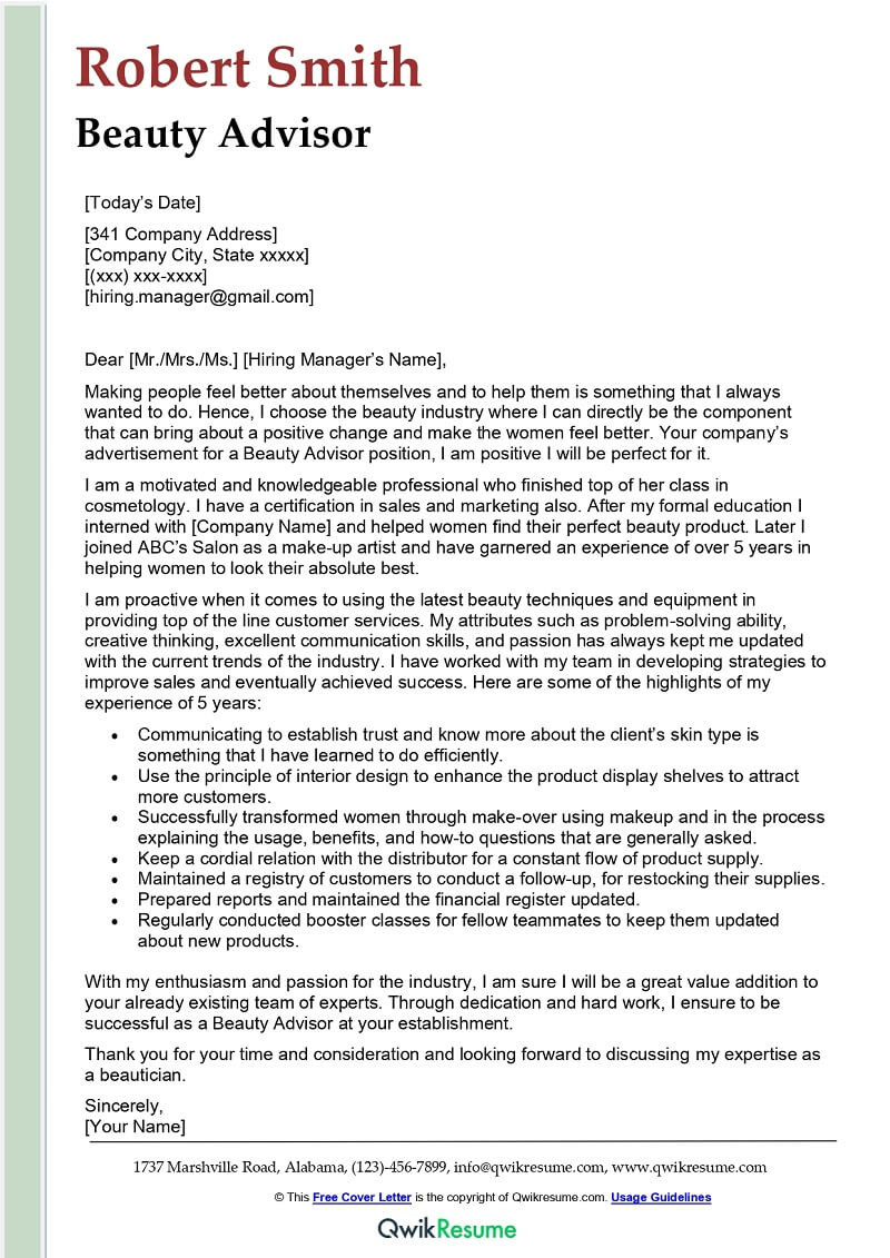 Beauty Advisor Cover Letter Examples – QwikResume
