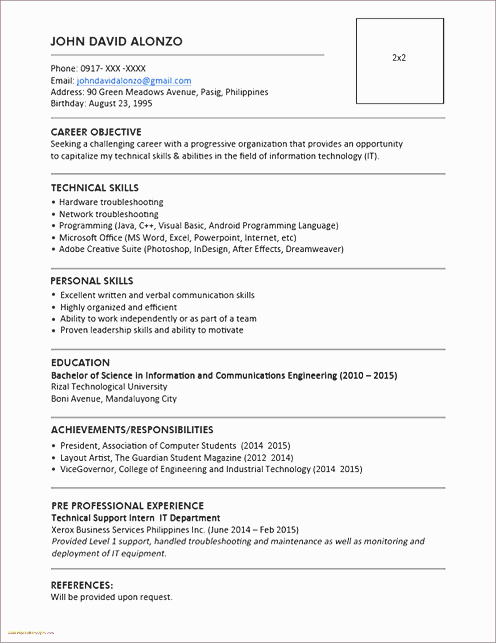 Sample Of Resume with 2×2 Picture Resume Template: Resume Template with 2×2 Picture and all other pictures, designs or photos on our website are copyright of their respective owners. we get our pictures from another websites, search engines and other sources to use as an inspiration for you. please contact us if you think we are infringing copyright of your pictures using contact page. we will be very happy to help you.