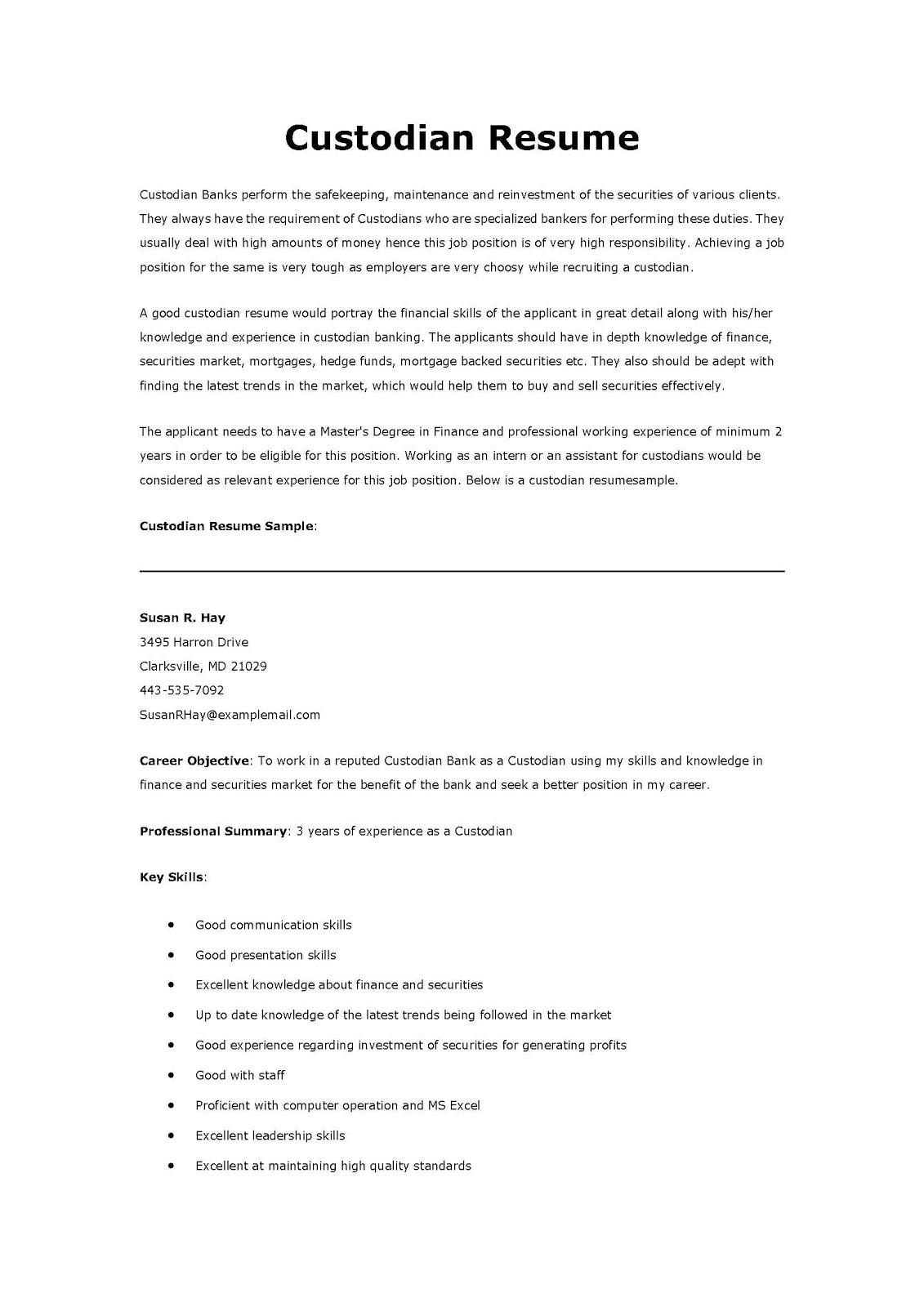 Sample Resume for A Custodian Position Resume Samples Custodian Resume and all other pictures, designs or photos on our website are copyright of their respective owners. we get our pictures from another websites, search engines and other sources to use as an inspiration for you. please contact us if you think we are infringing copyright of your pictures using contact page. we will be very happy to help you.