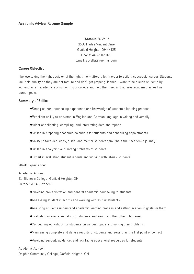 Employers use resumes as the first step in identifying and selecting attainable candidates for jobs and it is important that your resume properly presents your take steps experience and speculative qualifications. A well-written resume presents an fabulous image of you to employers. Employers see at hundreds of resumes for the same job and stop going on choosing just one. It is important that your resume is properly formatted and provides all relevant recommendation approximately you. Looking at professionally written sample resume for academic advisor position can support you create your own fabulous resume and come up with the money for every the information employers need.