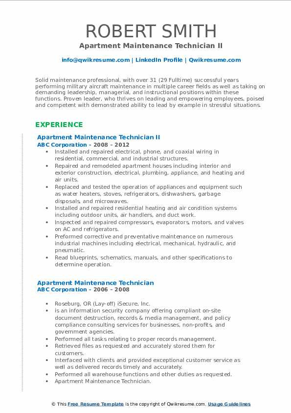 Sample Resume for Apartment Maintenance Technician Apartment Maintenance Technician Resume Samples and all other pictures, designs or photos on our website are copyright of their respective owners. we get our pictures from another websites, search engines and other sources to use as an inspiration for you. please contact us if you think we are infringing copyright of your pictures using contact page. we will be very happy to help you.