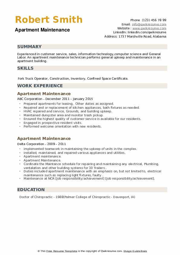 Sample Resume for Apartment Maintenance Worker Apartment Maintenance Resume Samples and all other pictures, designs or photos on our website are copyright of their respective owners. we get our pictures from another websites, search engines and other sources to use as an inspiration for you. please contact us if you think we are infringing copyright of your pictures using contact page. we will be very happy to help you.