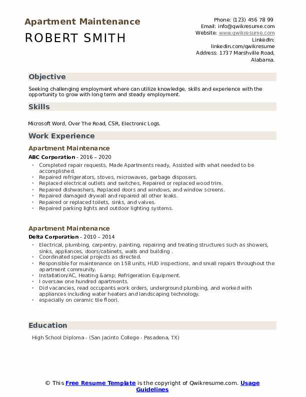 Sample Resume for Apartment Maintenance Worker Apartment Maintenance Resume Samples and all other pictures, designs or photos on our website are copyright of their respective owners. we get our pictures from another websites, search engines and other sources to use as an inspiration for you. please contact us if you think we are infringing copyright of your pictures using contact page. we will be very happy to help you.
