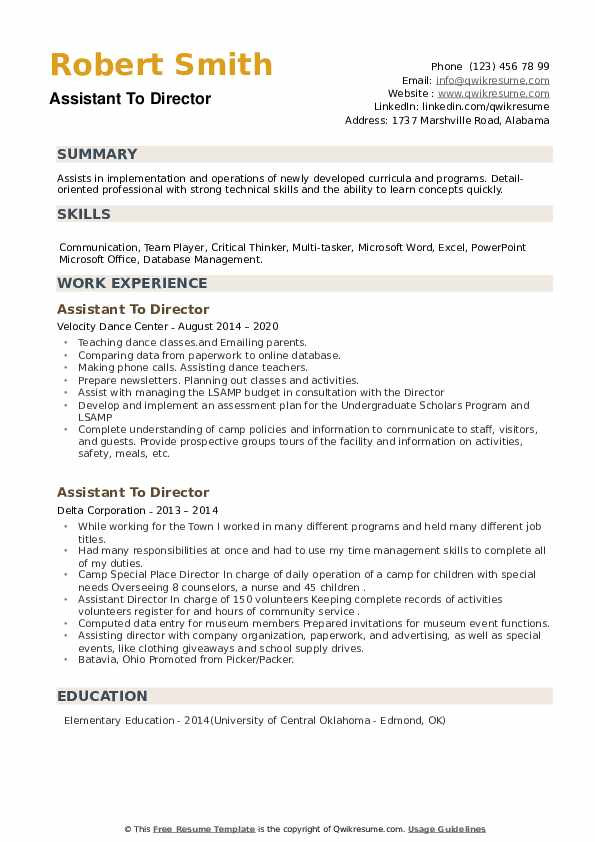 Sample Resume for assistant Director Of Films assistant to Director Resume Samples and all other pictures, designs or photos on our website are copyright of their respective owners. we get our pictures from another websites, search engines and other sources to use as an inspiration for you. please contact us if you think we are infringing copyright of your pictures using contact page. we will be very happy to help you.