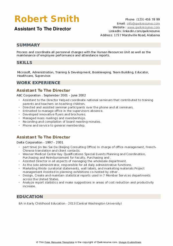 Sample Resume for assistant Director Of Films assistant to the Director Resume Samples and all other pictures, designs or photos on our website are copyright of their respective owners. we get our pictures from another websites, search engines and other sources to use as an inspiration for you. please contact us if you think we are infringing copyright of your pictures using contact page. we will be very happy to help you.