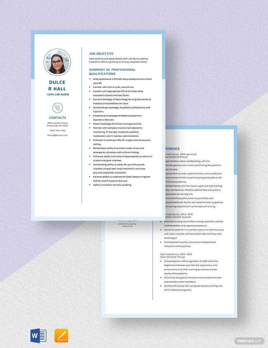 Sample Resume for Cardiac Cath Lab Nurse Cath Lab Nurse Resume Template – Word, Apple Pages Template.net and all other pictures, designs or photos on our website are copyright of their respective owners. we get our pictures from another websites, search engines and other sources to use as an inspiration for you. please contact us if you think we are infringing copyright of your pictures using contact page. we will be very happy to help you.