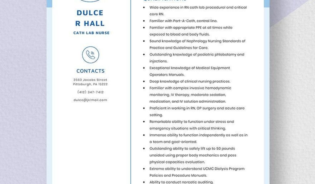 Sample Resume for Cardiac Cath Lab Nurse Cath Lab Nurse Resume Template – Word, Apple Pages Template.net and all other pictures, designs or photos on our website are copyright of their respective owners. we get our pictures from another websites, search engines and other sources to use as an inspiration for you. please contact us if you think we are infringing copyright of your pictures using contact page. we will be very happy to help you.