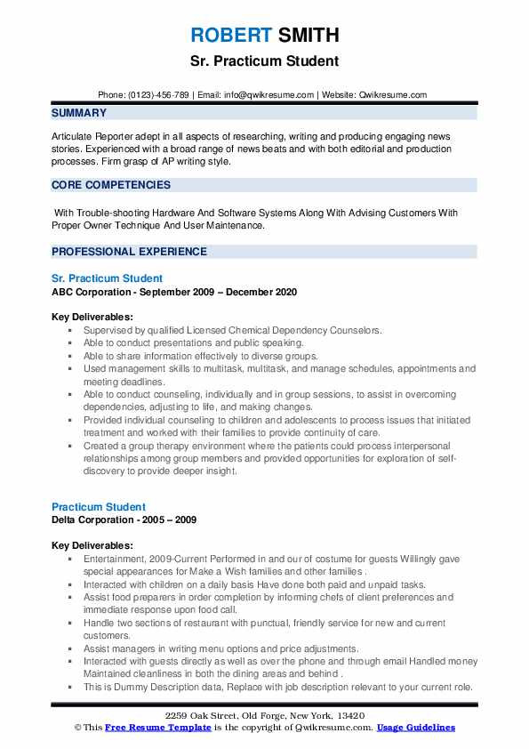 Sample Resume for Counseling Practicum Students Practicum Student Resume Samples and all other pictures, designs or photos on our website are copyright of their respective owners. we get our pictures from another websites, search engines and other sources to use as an inspiration for you. please contact us if you think we are infringing copyright of your pictures using contact page. we will be very happy to help you.