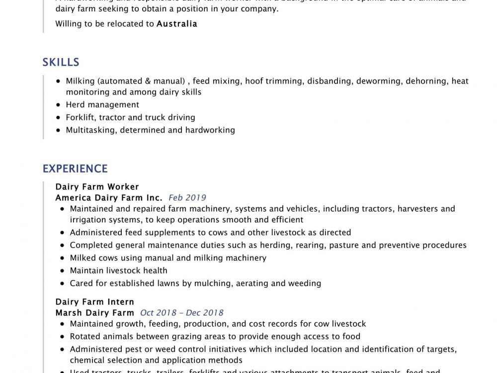 Sample Resume for Dairy Farm Worker Dairy Farm Worker Resume Sample 2021 and all other pictures, designs or photos on our website are copyright of their respective owners. we get our pictures from another websites, search engines and other sources to use as an inspiration for you. please contact us if you think we are infringing copyright of your pictures using contact page. we will be very happy to help you.