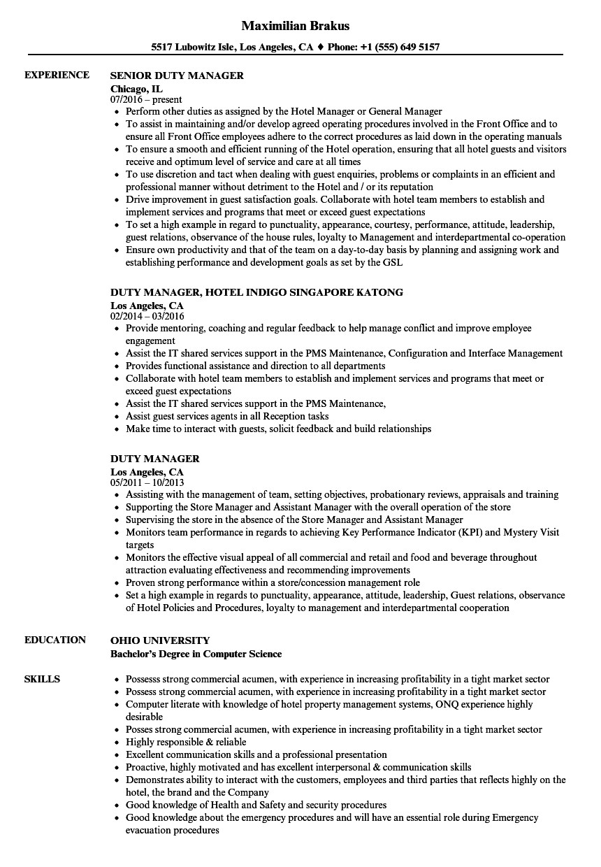 Sample Resume for Duty Manager Position Duty Manager Resume Samples and all other pictures, designs or photos on our website are copyright of their respective owners. we get our pictures from another websites, search engines and other sources to use as an inspiration for you. please contact us if you think we are infringing copyright of your pictures using contact page. we will be very happy to help you.