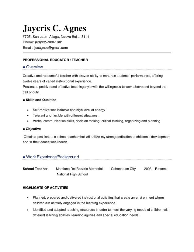 Back To Sample Resume for Elementary Teachers In the Philippines