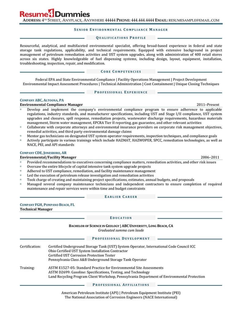 6 photos of the Sample Resume for Environmental Compliance Department