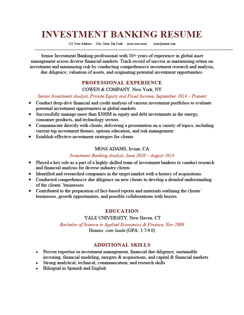 Sample Resume for Experienced Banking Professional Investment Banking Resume and all other pictures, designs or photos on our website are copyright of their respective owners. we get our pictures from another websites, search engines and other sources to use as an inspiration for you. please contact us if you think we are infringing copyright of your pictures using contact page. we will be very happy to help you.